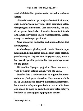 Bu kitabda görkəmli yazıçımız Cəlil Məmmədquluzadənin bir-birindən maraqlı 6 hekayəsi toplanmışdır. Bu hekayələrdə uşaqlara doğru ilə yanlışı ayırmaq, ədalətli, dürüst və məsuliyyətli olmaq kimi gözəl xüsusiyyətlər aşılanır. Hekayələrin sadə, axıcı süjeti, aydın dili və canlı obrazları uşaqların həm kitab oxumağa marağını, həm də dünyagörüşünü artıracaq. Məsələn, “İki alma” hekayəsindəki balaca oğlanın etdiyi yaxşılıq kiçik oxucuların qəlbini fəth edəcək. “Oğru inək” hekayəsi balacaları həm güldürəcək, həm də onlara mühitin insana necə təsir etdiyini göstərəcək.